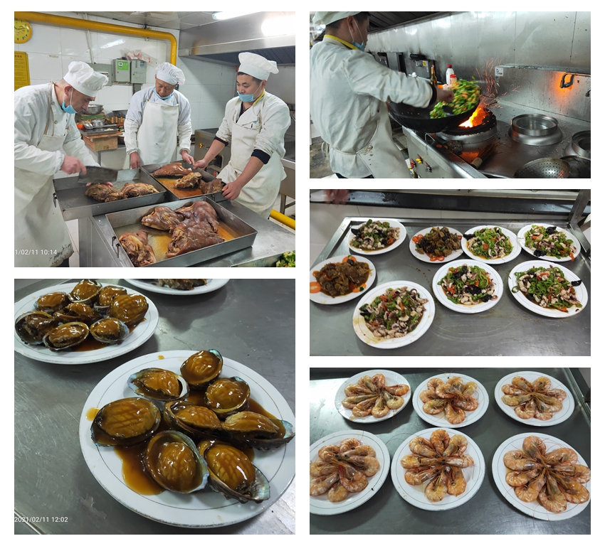 本次活动严格按照疫情防控要求,分别在集团总部园区和莱山威思顿两个会场进行,采用包间、食堂分区域就坐等方式举行,杜绝人员扎堆。为了让大家吃上美味的大餐,食堂师傅主动放弃了与家人团聚时光,一大早就赶到公司精心准备菜肴。
